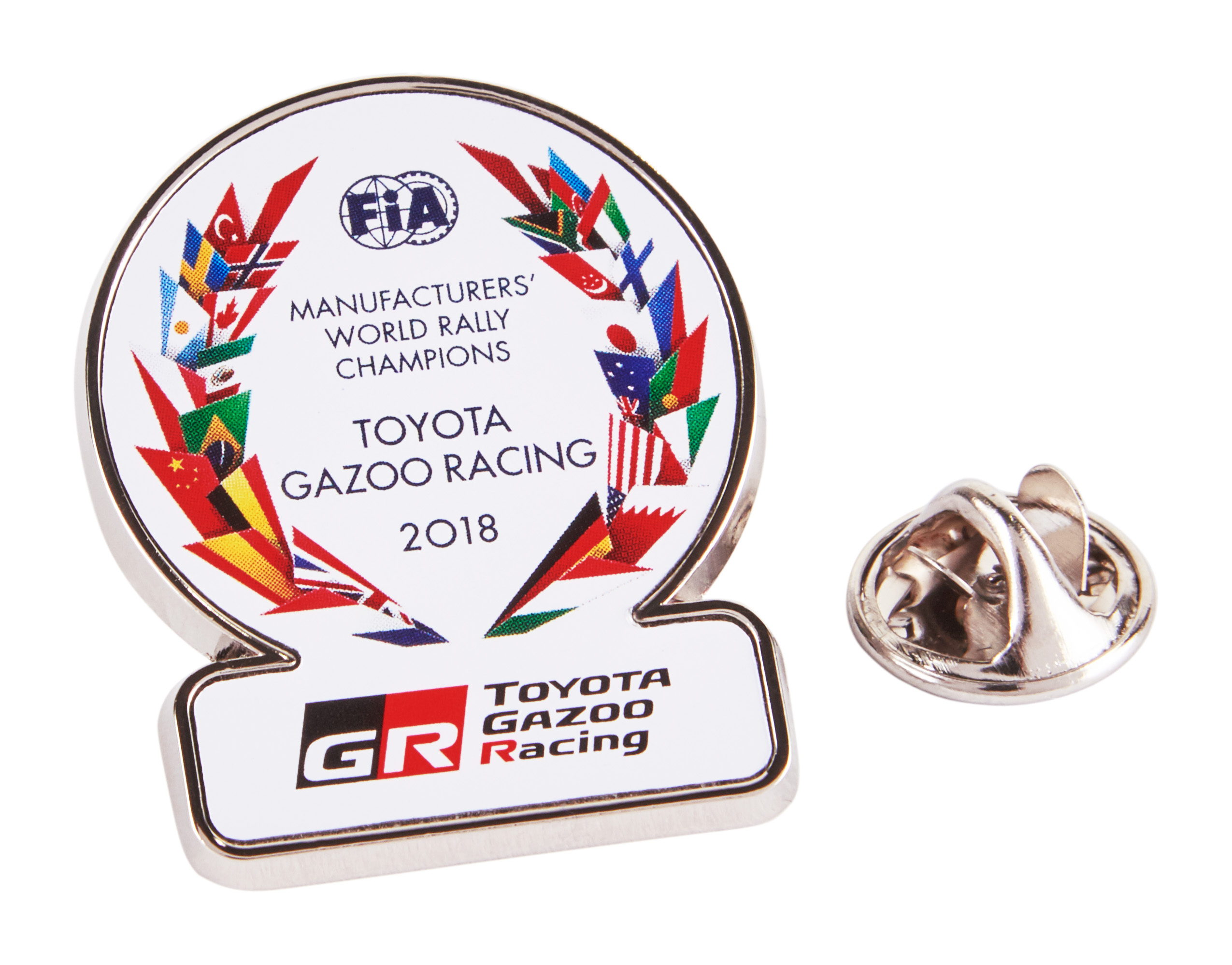 Own a piece of World Rally Championship history with this pin badge to celebrte TOYOTA GAZOO Racing achieving the 2018 Manufacturer's Title. Features the winning multi national flag lauren and TOYOTA GAZOO Racing logo o the front and secure butterfuly clip on the back. Presented in a smart branded gift box with branded sleeve