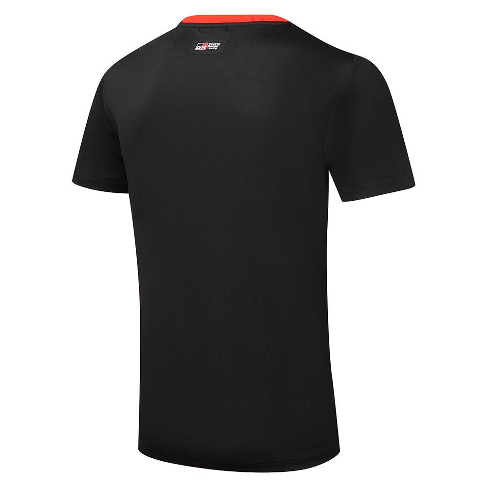 The TOYOTA GR men's black technical t-shirt is engineered from a high-quality polyester fabric to cater for an active lifestyle. This breathable, quick-drying and high wicking fabric is designed to keep you cool and comfortable when you need it most. Distinguished by contrasting ribbed collar and branded tape adorning the left shoulder for a unique aesthetic touch. Finished with a rubberised GR logo to the front and the TGR logo subtly positioned on the back, ensuring the wearer a blend of style and performance.