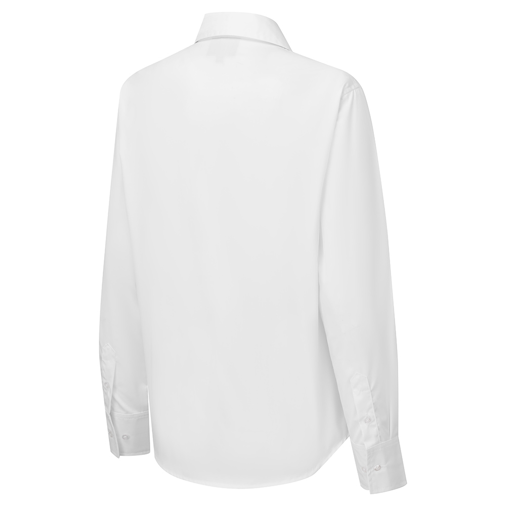 The TOYOTA GR women's formal shirt in a tapered fit , is constructed from a delicate cotton rich fabric, offering a balance of comfort and durability. The front features the TGR logo and a practical chest pocket. The long sleeves are equipped with buttoned cuffs and a sleeve placket that includes a link button, contributing to the overall sophisticated design.