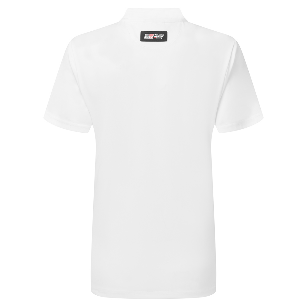 The TOYOTA GR women's white technical polo is crafted from a breathable, quick-drying polyester for athletic comfort, it features an elegant V-neck collar. The GR logo and TGR emblem subtly decorate the front and back, with a GR neck label and TGR shoulder tape emphasizing its sporty aesthetic. This polo encapsulates the essence of TOYOTA GR sporting spirit in a refined, subtle manner.