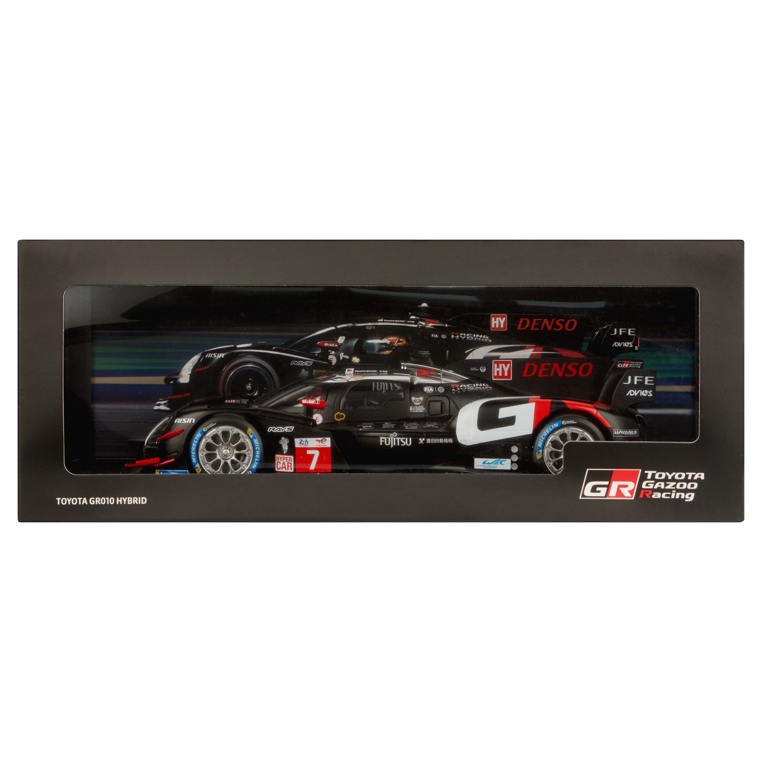 A 1-18 scale replica model of the TOYOTA GR010 HYBRID - No.7 car driven by Kamui Kobayashi, Mike Conway and Nyck de Vries at the 24 Hours of Le Mans endurance race in 2024. Individually finished and mounted with the team and 2024 sponsor logos and TOYOTA GR010 HYBRID - No.7 Le Mans 2024 printed, all presented in a branded box. A true collector's model which includes all the finer details of the TOYOTA GR010 HYBRID - No.7 car. Warning: not suitable for children under 14 years old.